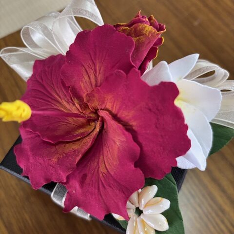 青空に映える真っ赤なアカバナー(ハイビスカス)とプルメリアが夏らしい明るい作品になりました!