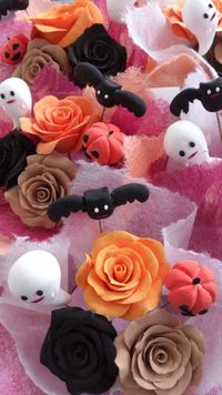 リースは豪華に大輪のバラを作って飾り、ミニアレンジはミニバラとかわいいハロウィンの仲間たちを作ります。